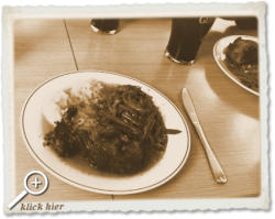 16:12 Uhr, Dieter sitzt scheinbar regungs- und sprachlos in der Ecke, Quaddel steht am Herd und legt auf, Holger und Grube reichen die Teller hoch. Ich versuche diese nicht wirklich befriedigende Gesamtsituation auf Video zu bannen. Da stehen ja noch nicht mal die Gläser geschweige denn das Guinness oder U-Berg auf dem Tisch. Nee, das wäre beim Smutje nicht passiert. In Zeiten als der noch funktioniert hat, kam das Essen mit viel mehr Liebe und Niveau auf den Tisch. Ich kann nur hoffen, daß der bald wieder das Kommando über Herd und Tisch bekommt. Wir müssen alles erdenkliche tun, damit das so schnell wie möglich passiert.