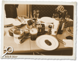 11.58 Uhr, der Smutje ist kaum weg, da steht Dieter schon wieder mit 'ner Guinnessbüchse neben mir. Jetzt geht das schon wieder los. Dem Gruppenzwang folgend, lass ich mir mein Glas auffüllen. Es ist wirklich nicht leicht sich immer auszuschließen.
