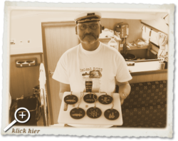 16:20 Uhr, wir sitzen alle gespannt und mit Dienstkleid im Salon. Ich habe die Videokamera startklar gemacht und rufe laut:"Du kannst jetzt kommen!".Die Kajütentür geht auf und Grube tritt in den Salon. In der Hand ein großes als Tablett umfunktioniertes Schneidebrett aus der Kombüse. Darauf liegen sechs Medaillen mit grüner Kordelschnur. Obwohl die 'K-Frage' schon vor Jahren geklärt wurde, hat der plötzlich auch eine Kapitänsmütze auf. Meine sofort eingeleitete Kritik wegen Amtsanmaßung wehrt er ab. "Das ist doch nur für die Siegerehrung, damit das offiziell ist!", versucht er mich zu beruhigen.