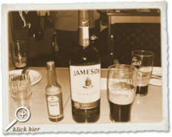 20:36 Uhr, die letzte 075'er Jameson ist alle. Draußen schüttet es wie aus Kannen. Hoffentlich hört das bald auf. Bei dem Scheißwetter macht es bestimmt keinen Spaß noch mal rüber bis zu Sean's Bar zu laufen.