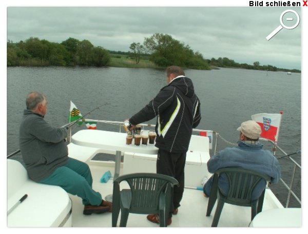 09:06 Uhr, Draußen sieht es grau aus. Kein Himmel oder geschweige denn Sonnenstrahl ist zu sehen. Aber es ist wenigstens trocken und windstill. Ein ungewohntes Geräusch geht mir mächtig auf den Sack. In mir kommt der Verdacht hoch, daß die Ü-60'er wieder ihrem Hobby nachgehen. Von der Tonfrequenz her dürfte die Heizung auf Volltouren laufen. Ich höre die ersten Geräusche aus der Kombüse und es duftet nach Kaffee. Eins macht mich allerdings stutzig. Ich bin nicht durch den üblichen Lärm geweckt wurden, der sonst immer (für mich gefühlt kurz nach Mitternacht) aus Richtung Ü-60 Kabine bis zu mir durchdringt. Es ist bereits nach Neun. Entweder hab ich so fest geschlafen, daß ich nichts gehört habe, oder Quaddel hat's verpennt. Wenn das der Fall ist, kann das nur daran liegen, daß er gestern nicht wie üblich den ganzen Nachmittag und Abend mit schlafen verbracht hat, sondern mit im Pub war und erst weit nach Mitternacht als Letzter in seiner Koje verschwunden ist. Das wäre natürlich ein guter Ansatzpunkt für die kommenden fünf Tage. Ich muss nur jeden Abend irgendwie dafür sorgen, daß Quaddel so spät wie möglich schlafen geht, und schon kann ich selber, wie eigentlich im 'Urlaub' üblich, morgens etwas länger schlafen. 09:20 Uhr, Quaddel deckt den Frühstückstisch. Wenn er das in Zukunft immer um diese Uhrzeit macht, hätte ich nichts dagegen. Holger sitzt bereits auf seinem angestammten Platz und setzt mit den Worten:"Einen kleinen Schwips hatte ich gestern aber auch", zu einem kräftigen Schluck aus der Mineralwasserflasche an. Bei dem Anblick schüttelt's mich gleich. Ich konnte nicht mal mit Zähneputzen den Geschmack nach Verwesung aus meinem Mund und Hals verbannen, da funktioniert das mit Wasser aus der Flasche erst recht nicht. Ich glaube, das Einzige was jetzt hilft ist ein U-Berg. 09:32 Uhr, Da heute Tag-1 der Tour ist, gibt's wie immer 'Gedeck 1 ' zum Frühstück. Um den Tisch etwas bunter aussehen zu lassen, bringt der Smutje noch einen Teller mit 'SchüttelgurkenSchüttelgurken Grüne Gurke in Scheiben geschnitten und mit Zucker, Salz, Essig, Öl, Senfkörner und Dill in einem geschlossenen Behälter geschüttelt. ' aus der Kombüse. Gestern Abend als wir im Pub waren lief (angeblich) im Hintergrund irgend ein Fußballspiel. Davon weiß ich allerdings nichts. Aber Holger und Quaddel behaupten das zumindest. "Wer hatt'n da eigentlich gespielt? ", ist die Frage. Hier ist das 'Langzeitgedächtnis' gefragt. "Dieter, weißt Du noch wer gestern gewonnen hat? ". "Ich, war ich gestern im Pub? ", antwortet Dieter mit einer Gegenfrage. 09:46 Uhr, Holger reicht fünf U-Berg aus dem 'Depot'. 09:56 Uhr, Ein Flachmann macht die Runde. Wie der das wohl bis auf den Frühstückstisch geschafft hat? 10:06 Uhr, Der Smutje hat Holger und Quaddel zum Küchendienst verpflichtet. Dieter kümmert sich ums auffüllen der Wassertanks und ich als Käpt'n suche mein Equipment zusammen. Fernglas, Navigations-Karte, Sonnenbrille, Zigarillos, Feuerzeug und Guinnessglas. Zur Sicherheit stecke ich mir noch 'nen U-Berg in die Hosentasche. 10:30 Uhr, Ich stehe in meiner Kapitäns-Kajüte und bin entsetzt. Auf dem freien Bett, wo sonst mein Freund Grube schläft, liegt meine Wetterjacke verziert durch einen fetten Orden. Dabei handelt es sich aber nicht um ein Stück Blech mit 'nem bunten Band dran, sondern um einen kapitalen Vogelschiss. Da hat doch tatsächlich so ein Drecksvogel genau durch das offene Dachluken Fenster gezielt. Von Möhren und schwulen Hechten 10:46 Uhr, Leinen los!! Die Tour 2014 hat soeben begonnen. Wie immer stellt Holger unmittelbar nach Ablegen die obligatorische Frage:"Sagst Du Bescheid wenn wir angeln können? ". Ich würde behaupten, daß da schon ein gewisses 'Suchtpotential' vorhanden ist. 10:52 Uhr, Ich gebe die Angeln frei. 11:08 Uhr, In meinem Hals macht sich etwas Trockenheit bemerkbar. "Andere Jahre gab es spätestens um diese Zeit das erste Guinness! ". Holger scheint es ähnlich zu gehen, und er stimmt mir zu:"Dieter, Du kennst deine Aufgabe! ". 11:10 Uhr, Dieter bringt für jeden eine geschälte Möhre Hat der 'nen Hörfehler oder was? "Ich kann nichts dafür, die hat mir der Smutje in die Hand gedrückt ", meint Dieter. Holger stellt fest:"Möhren sind meines Wissens schwer zu verdauen. Kann man da was dagegen tun? ". Dieter verschwindet wieder unter Deck. Mal sehen ob er's diesmal geschnallt hat. 11:16 Uhr, Er scheint es verstanden zu haben. Dieter bringt 'ne Runde Guinness. 11:20 Uhr, Der Smutje kommt jetzt mit 'ner Flasche Bushmills in der Hand und den Worten:"Ich habe gehört, daß Möhren schwer zu verdauen sind ", ebenfalls mit hoch aufs Oberdeck. 11:42 Uhr, Quaddel gibt auf. "Ich gehe jetzt schlafen! ", sagt er und verschwindet unter Deck. Dem scheint doch noch der gestrige Tag in den Knochen zu stecken. Das ist die Chance für Holger, der sieht seine Stunde gekommen. Er rüstet sein Equipment auf und zwar in Form eines pinkfarbenen Wobblers, den er an seiner Angel befestigt. Pink! Da wird mir ja schon beim hingucken ganz komisch. 12:08 Uhr, Wie aus dem nichts ist Quaddel plötzlich wieder aufgetaucht. Sein Platz und seine Angel sind allerdings von Dieter besetzt, der schon seit 'ner ganzen Weile versucht einen Fisch an den Haken zu bekommen. So kommt es, daß Quaddel jetzt die Aufgabe von Dieter übernehmen muss und ab sofort fürs Catering verantwortlich ist. 12:10 Uhr, Quaddel lässt 'ne Runde Guinness ein. 12:16 Uhr, "Halt Hecht!!!" Da ich schon gar nicht mehr damit gerechnet habe, erschrecke ich regelrecht und kippe mir fast mein Guinness über die Hose. Es scheint, irgend ein Fisch hat Gefallen an Holgers pinkfarbenem Wobbler gefunden. Irgendwie gibt mir das zu Denken. Kann man als Fisch auch schwul sein?  So wie sich Holgers Angel biegt, muss das aber ein ganz schön kräftiges 'Kerlchen' sein. Quaddel begibt sich schon mal mit dem Gaff in der Hand nach unten auf die Heckplattform. Holger gibt alles, er kurbelt und kurbelt und …. Zon