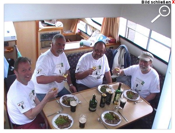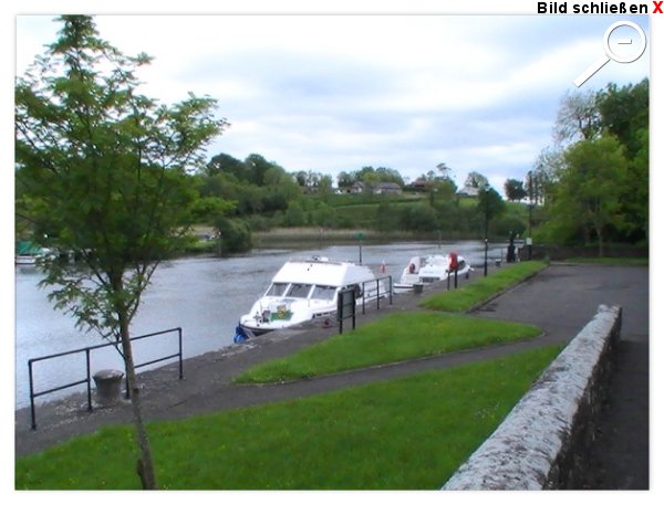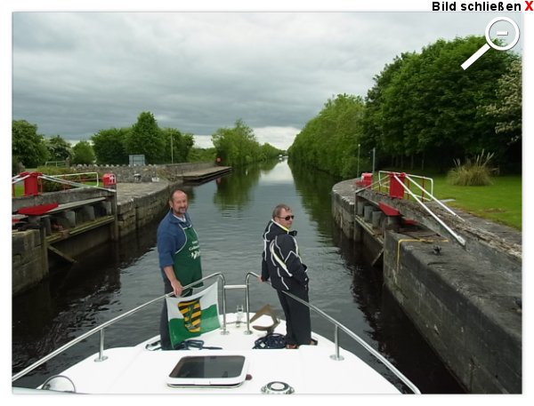 | 08:02 Uhr, Die Heizung springt an. Ich versteh's einfach nicht, das ist doch nun wirklich nicht kalt. Wieso muss da schon wieder die Heizung laufen? Aber wenigstens scheint Quaddel sich an die Zeitvorgabe gehalten zu haben. Zwar hat er genau das untere Limit ausgereizt, aber immerhin. 08:30 Uhr, Ich schaue aus dem Fenster von meiner Nasszelle und sehe Holger mit der Angel draußen rumlatschen. So ist's richtig, abends vor Sonnenuntergang ins Bett gehen und dann früh Stress machen. 08:48 Uhr, Zum Frühstück gibt es Spiegelei mit Toastbrot. Irgendwer hat auch schon die erste Ration U-Berg auf den Tisch gestellt. 08:52 Uhr, Dieters Handy klingelt! Es ist Grube, der uns zum Vatertag gratulieren will. Wenn er selber auch nicht mit ist, so ist er wenigstens im Geiste mit dabei. Das ist ein feiner Zug von ihm 09:06 Uhr, Die erste U-Ration wird frei gegeben. Jameson in Jamestown 09:46 Uhr, Es geht los zur fünften Etappe. Heute wollen wir bis Jamestown fahren. Während der Planungsphase für die Tour 2014 ist mir aufgefallen, daß wir da noch nie waren. Deshalb hab ich beschlossen dort zu übernachten. Vom Wetter her sieht es heute nicht ganz so gut aus wie die letzten Tage. Momentan ist es noch komplett bedeckt und keine Sonne zu sehen. Aber wenigstens ist es trocken und windstill. 09:54 Uhr, "Gestern gab's 10:10 Uhr Guinness! ", sage ich so in die Runde. "Aber momentan sieht es eher nach Grog aus. Wir sollten die Chance nutzen ehe die Sonne wieder durchkommt ". "Soll ich Grog machen? ", fragt der Smutje. Es gibt keine Gegenstimme. Holger fügt noch hinzu:" Besser Grog als wenn Dieter sich den ganzen Zucker ins Guinness kippt ". "Oder du dir den Zucker auf den Bratkloß schmierst ", kann ich mir nicht verkeifen zu ergänzen. 10:06 Uhr, Dieter bringt den vom Smutje angekündigtem Grog hoch auf's Oberdeck. 11:36 Uhr, Wir haben vor Albert Lock angelegt. Diesmal haben wir nicht soviel Glück, die Schleuse ist zu. Aber wir haben ja Urlaub und somit Zeit und keinen Termindruck. Holger hat sich seine Angel geschnappt und versucht vom Steg aus was an den Haken zu bekommen. Ich bezweifle aber stark, daß dieses Vorhaben von Erfolg gekrönt sein wird. 11:38 Uhr, Dieter bringt mir noch 'nen Grog. 12:04 Uhr, An der Schleuse scheint sich was zu tun. Das Wasser vor dem Tor gerät sichtbar in Bewegung. Ich starte schon mal den Diesel. 12:06 Uhr, Die Ampel ist auf Grün gesprungen und das Tor öffnet sich langsam. 12:08 Uhr, Wir liegen in der Schleuse. Was mir schon seit Jahren immer wieder auffällt, ist die extrem gepflegte Anlage. Dies betrifft sowohl das kleine Häuschen als auch das komplette Gelände. Der Rasen ist 1A gemäht, die Blumenbeete mit viel Liebe angelegt und die Hecken und Ziergehölze perfekt geschnitten. Das könnte unter anderem auch daran liegen, daß hier scheinbar eine Frau das Kommando hat. Zuminest hab ich schon mal eine solche beim Blumen schneiden beobachtet. 12:12 Uhr, Das Schleusentor öffnet sich und wir nehmen das letzte Stück der heutigen Etappe in Angriff. Der Smutje fragt wie lange wir ungefähr noch brauchen. Ich blicke kurz auf die Karte und sage:"Wenn wir mit dem Tempo weiter fahren ca. 'ne halbe Stunde. Wenn Du allerdings eher da sein willst, müsste ich 'ne Kohle nachlegen ". "Ne, ne, passt schon ", meint er. "Mir geht's nur wegen Essen vorbereiten ". Angesichts der noch recht frühen Zeit, einigen wir uns darauf bezüglich Mittagessen noch keinerlei Aktivitäten zu starten. Es reicht, wenn er erst nach dem Anlegen in Jamestown damit beginnt. 12:18 Uhr, "Hier im Jamestown Canal einen Jameson ", meint Holger, und reicht die Pulle Jameson in die Runde. Prost! Paparazzi und Dienstkleider 12:42 Uhr, Das Anlegemanöver war etwas 'knifflig', zumindest für den Teil der Crew der für das Festmachen des Bootes verantwortlich ist. Die gewohnte Variante, langsam ranfahren und dann einen kleinen Hüpfer runter auf den Anleger, geht hier nicht. Die Kaimauer ist nämlich ziemlich hoch und aus Quaddels Blickwinkel gesehen sogar 'unüberwindlich' hoch. Hier ist klettern angesagt. Aber Dieter und Holger haben diese Herausforderung mit Bravour gemeistert. 12:48 Uhr, Ich stehe ganz oben auf der Flybridge und mache meine obligatorische 360° rundum Videoaufnahme. Gerade als ich fast fertig bin, höre ich es von unten stöhnen und fluchen. In mir steigt plötzlich die Sensationsgeilheit eines Paparazzo hoch, und ich halte voll drauf.  Dieses Video bei Youtube gepostet, hätte sicher innerhalb kürzester Zeit eine Million Klicks. Ich habe Quaddel 'abgeschossen' als er unter größten Anstrengungen von Bord geht 'gleitet'. Er schiebt sich die Mauer hoch und zieht sich dann an einem dort befindlichen Geländer in eine senkrechte Position. 13:06 Uhr, Während Quaddel gerade dabei ist sein 'Dienstkleid' anzuziehen hat Dieter es bereits getan. "Wieso jetzt schon Dienstkleid ", frage ich. "Das wurde befohlen ", meint Quaddel. "Von wem? ", hake ich nach. "Na Vatertag wird doch immer Dienstkleid getragen ", sagt Dieter. "Ja schon ", sag ich, "aber doch jetzt noch nicht. Später dann zum Mittagessen oder heute Abend im Pub ". Jetzt kommt Holger plötzlich auch mit Dienstkleid und der Smutje meint:"Dienstkleid ist Pflicht! ". 4:1 Stimmen, das grenzt ja schon fast an Meuterei !!! Da muss ich mich auch als Käpt'n geschlagen geben. 13:12 Uhr, Ich trage mittlerweile auch Dienstkleid. Draußen, im sehr gepflegten Bereich rund um den Anleger, entdecke ich an einem Baum ein Reklameschild für einen Pub hier im Ort. "YOUR LIVE MUSIC VENUE" kann ich schon von weitem lesen. Das sieht schon mal gut aus, das muss ich mir näher ansehen. Drei Minuten Fußweg von hier, steht im 'Kleingedruckten' unter dem Foto vom Pub. Schön und gut denke ich mir, aber wir befinden uns hier genau an einer Kreuzung. Da ist dieser schlichte Hinweis nicht wirklich zielführend. Soll ich nun drei Minuten nach links, rechts oder gerade aus laufen? 13:18 Uhr, Ich habe mich für die letzte Möglichkeit entschieden. Nach ca. drei Mi