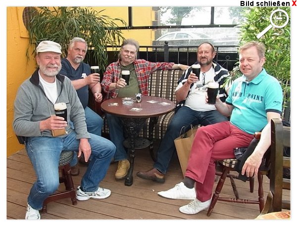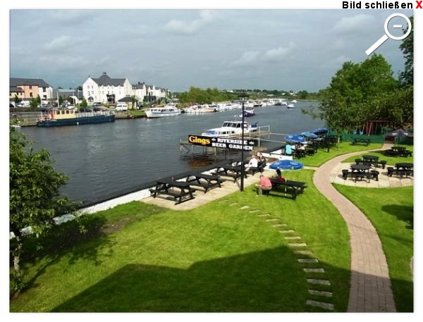 | 08:02 Uhr, Ich höre erste Schritte. 08:06 Uhr, Die Heizung läuft! Naja, zumindest hat Quaddel endlich den Zeitplan verinnerlicht und hält sich auch dran. Zumindest scheint er die die Minimalvorgaben verstanden zu haben. Wenn er wenigsten zum Baguettenladen gegangen wäre, dann würde ich ja unter Umständen etwas Verhandlungsbereitschaft, was die Zeiten vor 08:00 Uhr betrifft, zeigen. 08:36 Uhr, Das Wetter sieht gut aus. Etwas Sonne, nur vereinzelte Wolken, trocken und angenehm von der Temperatur. So kann es bleiben. Der Geruch nach gebratenem Schinkenspeck der aus der Kombüse strömt, verleitet mich zur Annahme, heute gibt's Rührei zum Frühstück. Dem Gesetz der Serie folgen müsste das auch so sein. Sonntag gekocht, Montag gespiegelt, Dienstag gerührt, Mittwoch gekocht und Donnerstag gespiegelt. Also gibt's heute Rührei. 08:50 Uhr, Es gibt Rührei mit Schinken und Baguette. Häh, wieso Baguette War Quaddel vielleicht doch im Baguettenladen? Aber dann würde nicht nur auf meinem Teller ein Baguette liegen, oder? Der Smutje muss mir irgendwie eine leichte Verwirrung vom Gesicht ablesen. "Das hab ich noch in meinen Restbeständen gefunden und aufgebacken ". Guter Mann, der Smutje. 09:04 Uhr, die vorletzte U-Ration wird frei gegeben. 09:30 Uhr, Während Dieter sich wie immer um die Wassertanks kümmert, packt Quaddel sein Angelequipment weg. "Streichst Du etwa schon die Segel? ", frage ich ihn. "Man muss eben wissen, wann man verloren hat! ", ist die schlichte Antwort. Der Endspurt 09:52 Uhr, Wir nehmen die letzte Etappe der Tour-2014 in Angriff. Das Ziel ist Carrick On Shannon. Wenn alles nach Plan läuft, werden wir so um die Mittagszeit dort einlaufen. 09:56 Uhr, Quaddel lässt 'ne Runde Guinness ein. Holger hat abgelehnt und konzentriert sich voll auf seine Angel. Der will's heute nochmal wissen. Dieter sowie der Smutje sind unter Deck. Somit wird's nur 'ne kleine Runde. Quaddel reicht mir ein Glas, Prost!. 10:00 Uhr, "Halt Hecht"  Scheiße, nicht mal in Ruhe Bier trinken kann man im Urlaub. Zum Glück war's aber wieder ein 'Abriss'. 10:16 Uhr, "Hecht"  Jetzt ist's mir egal, mein Guinness ist alle. Gas raus, kurz rückwärts zum Bremsen, leicht vorwärts, Boot vorsichtig in die Mitte manövrieren, Position halten, Videokamera startklar machen und filmen. Wenn ich's mir richtig überlege, hab ich eigentlich immer viel mehr Stress als die Heinis mit ihren Angeln. 10:20 Uhr, Der Hecht ist tatsächlich an Bord. Allerdings ist's wieder nur ein 'Kinderhecht' und somit für den Smutje und seine Pfanne uninteressant. Deshalb darf er wieder zurück ins Wasser. 10:28 Uhr, Bis jetzt hat das Wetter gehalten. Es ist sogar noch besser geworden als heute Morgen. Die Sonne hat mittlerweile wieder das Sagen und brennt mir im Nacken. Das Kombüsenrohr versucht mir zu 'erzählen', was es heute zu Mittag gibt. Wenn ich's richtig 'übersetzt' habe, handelt es sich um Makkaroni mit und mit ohne roter Soße. 11:02 Uhr, Mit den Worten:" Das war's, fertig mit Angeln! ", steht Holger plötzlich auf und holt seine Angel ein. 11:06 Uhr, Holger 'entflaggt'! Mit kurzen und präzisen Schnitten entfernt er seine Thüringenflagge von der Reling. So zeitig hat der das noch nie getan. Der muss innerlich wirklich schon mit der Tour-2014 abgeschlossen haben. 11:08 Uhr, Wir sind kurz vor Carrick On Shannon und passieren eine riesige Anlage mit Ferienwohnungen und Bootsanlegern. Das sind bestimmt auch noch 'Überbleibsel' aus den Boomjahren. Da wurden Unmengen solcher Anlagen entlang vom Shannon und auch Shannon-Erne Waterway 'hingeknallt'. Ich würde mal ganz spontan behaupten, da steht mittlerweile gut die Hälfte zum Verkauf. Natürlich kann ich mich auch irren, aber ein Großteil davon sieht schon seit Jahren ziemlich verlassen und teilweise auch sehr verkommen aus. 11:14 Uhr, Carrick On Shannon ist in Sichtweite und somit leider auch das Ende der Tour-2014. 11:18 Uhr, Auf Backbord liegt der Biergarten von "Gings Bar". Die Chancen stehen nahe 100%, daß wir den im weitern Verlauf des Tages auch noch von innen sehen werden. 11:22 Uhr, Zeitiges kommen sichert die besten Plätze. In diesem speziellen Fall, der Platz genau am Anleger mit der Dieselsäule. Das hat den Vorteil, daß wir uns gleich 'abfertigen' lassen können und nicht noch zweimal umparken müssen. 11.30 Uhr, Ich bin oben im Office und melde unsere Ankunft. Nach nunmehr Neunzehn Touren beim gleichen Vermieter verwundert es nicht, wenn man sofort mit seinem Namen begrüßt wird. Nebenbei erfahre ich noch, der Transfer zum Flughafen startet morgen um 10:00 Uhr. Angesichts der Tatsache, daß unser Flug Dublin-Frankfurt aber erst um 18:00 Uhr geht, ist das trotzdem ziemlich zeitig. Aber gut, es hätte auch schlimmer kommen können. So haben wir wenigsten nicht schon Stress am frühen Morgen und können halbwegs 'ausschlafen'. 11:40 Uhr, Holger und Dieter vertreiben sich die Zeit indem sie diverse Brotreste an eine Schwanenfamilie verfüttern. Rein vom Gesichtsausdruck her scheint das dem Smutje irgendwie zu missfallen. Sonst will der immer alles gleich 'wegglatschen'. Hatte der die Brotreste evtl. schon anderweitig verplant? Wie angekündigt kommen noch vor 12:00 Uhr zwei Mitarbeiter von CC. Einer kümmert sich um den Diesel, während der Andere die 'Gülletanks' abpumpt. Die obligatorischen Fragen ob alles okay ist und ob es Probleme gab, beantworte ich mit ja bzw. nein. Ich mache die noch darauf aufmerksam, daß auf der Flybridge die Ruderanzeige nicht funktioniert. Allerdings gehe ich davon aus, daß da bezüglich 'Reparatur' nichts läuft und die uns nachfolgende Crew genau so wieder losfahren wird. 11:52 Uhr, Nach diversen Fußtritten gegen die Fender und einer zusätzlichen Sichtkontrolle haben wir die sogenannte 'Bootsabnahme' hinter uns. Die Dieselsäule informiert uns, daß wir 77,77 Liter Diesel verbraucht haben und dafür 120,55 € Zahlen müssen. Das macht einen Literpreis von satten 1,55 €. Da soll mal noch einer sagen, in Deutschland is
