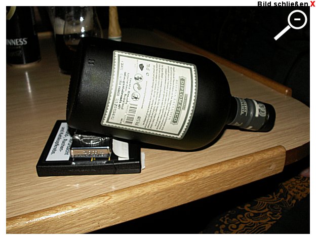 22:32 Uhr, zum Glück ist die Flasche nicht aus Klarglas so daß wir uns gestern -was den Rest-Füllstand anbelangt- irgendwie getäuscht hatten. Es reicht noch locker um zwei Gläser gut zu füllen. Um trotzdem ganz sicher zu sein, daß auch nicht der Kleinste Rest dieses hervorragend schmeckenden Rums im Flaschencontainer landet, positioniere ich die 'leere' Flasche zur Sicherheit nochmal in der 'Sammelstellung'.
