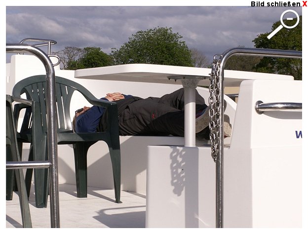 10:02 Uhr, herrliches Wetter, strahlender Sonnenschein, kein Wind und keine Wellen. Trotzdem hab ich das Gefühl, daß unser Boot permanent schaukelt. Keine Ahnung an was das wohl liegen kann. Ich glaub, ich brauch 'nen U-Berg. Vielleicht funktioniert dann mein Vestibularsystem wieder etwas besser.