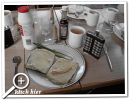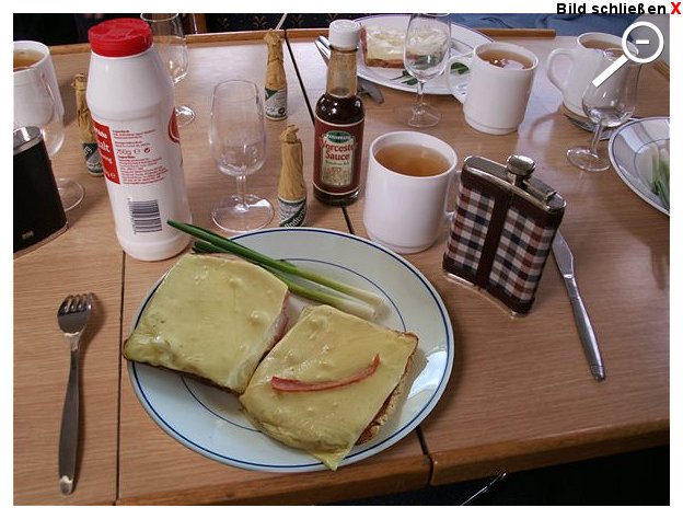 09:42 Uhr, es gibt Rührei zum Frühstück. Da ich im Moment über keinen Fotoapparat verfüge, kann ich nicht mal wie üblich ein Frühstücksfoto machen.  Da wäre zwar noch meine Videokamera, die kann nämlich laut Beschreibung auch Standbilder aufnehmen. Aber die bringt im Standbildmodus immer eine Fehlermeldung "SteadyShot aktiv, keine Standbilder möglich". Was weiß ich was dieses SteadyShot ist. Und jetzt in meinem Zustand find ich maximal den ein und aus Knopf aber nicht die Stelle im zigsten Unter-Unter-Menü, wo dieses blöde SteadyShot deaktiviert wird. Damit bin ich mal wieder an der Stelle, wo man nur noch sagen kann "Früher war alles besser ". Gut, in dem Fall müsste es heißen einfacher. Da hat man 'einfach' durch den Fotoapparat durchgeguckt, draufgedrückt und fertig. Und es hat IMMER funktioniert. Ich glaube, ich muss die Sache mal dem Praktikanten übergeben. Der behauptet ja immer, daß er 'IP-affin' sei. Radios kann man damit zwar nicht ausschaltenausschalten Siehe dazu auch Kapitel Anreise 22:00 Uhr , aber vielleicht reicht es um Videokameras so einzustellen, daß die Standbilder machen.